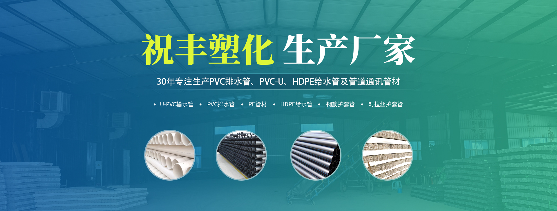 安陽(yáng)市祝豐塑化有限公司坐落在滑縣工業(yè)園區(qū),東臨大廣高速,西臨京珠高速,是鄭州、鶴壁、安陽(yáng)、濮陽(yáng)四個(gè)城市的輸紐,交通便利、環(huán)境優(yōu)美。       公司始建于八十年代,經(jīng)過二十余年的艱辛創(chuàng)業(yè),規(guī)模不斷壯大,由十多萬元資產(chǎn)的小廠,發(fā)展到現(xiàn)占地面積達(dá)一萬多平,建筑面積一萬平,資產(chǎn)2000多萬元管材生產(chǎn)企業(yè)。公司生產(chǎn)PVC-U、PVC排水管、HDPE給水管、鋼筋護(hù)套管管道通訊管材等產(chǎn)品,廣泛用于農(nóng)田節(jié)水、高山引水、人畜用水、建筑、電力通訊等多種用途,品種齊全。為了滿足用戶需求,可承攬各種給水、節(jié)水、灌溉工程。“祝豐塑化”憑借強(qiáng)勁的實(shí)力,優(yōu)良的管理水平。“以質(zhì)量求生存,以信譽(yù)求發(fā)展”的原則全力以赴和大家共同塑造美好未來。..